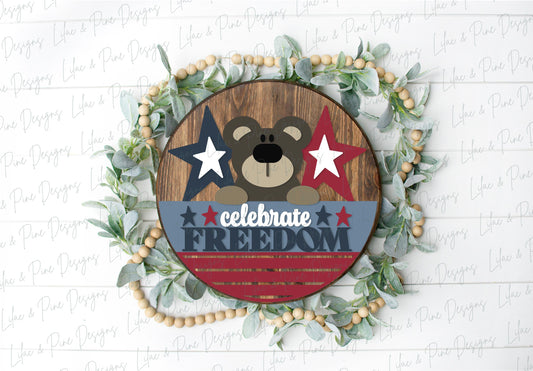 4th of July welcome sign, patriotic bear SVG, folk art, celebrate freedom SVG, Independence Day door hanger SVG, Glowforge, laser cut file