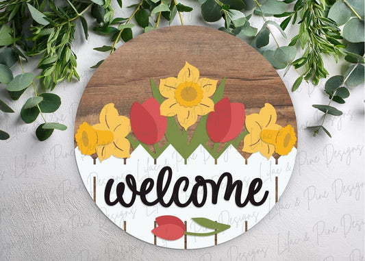 tulip and daffodil door hanger SVG, spring floral welcome sign SVG, spring flower round sign, Glowforge Svg, laser cut file, Cricut SVG