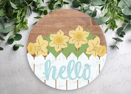 Hello Spring door hanger, daffodil welcome sign svg, floral spring decor, spring flower SVG, Glowforge SVG, laser cut file, Cricut SVG