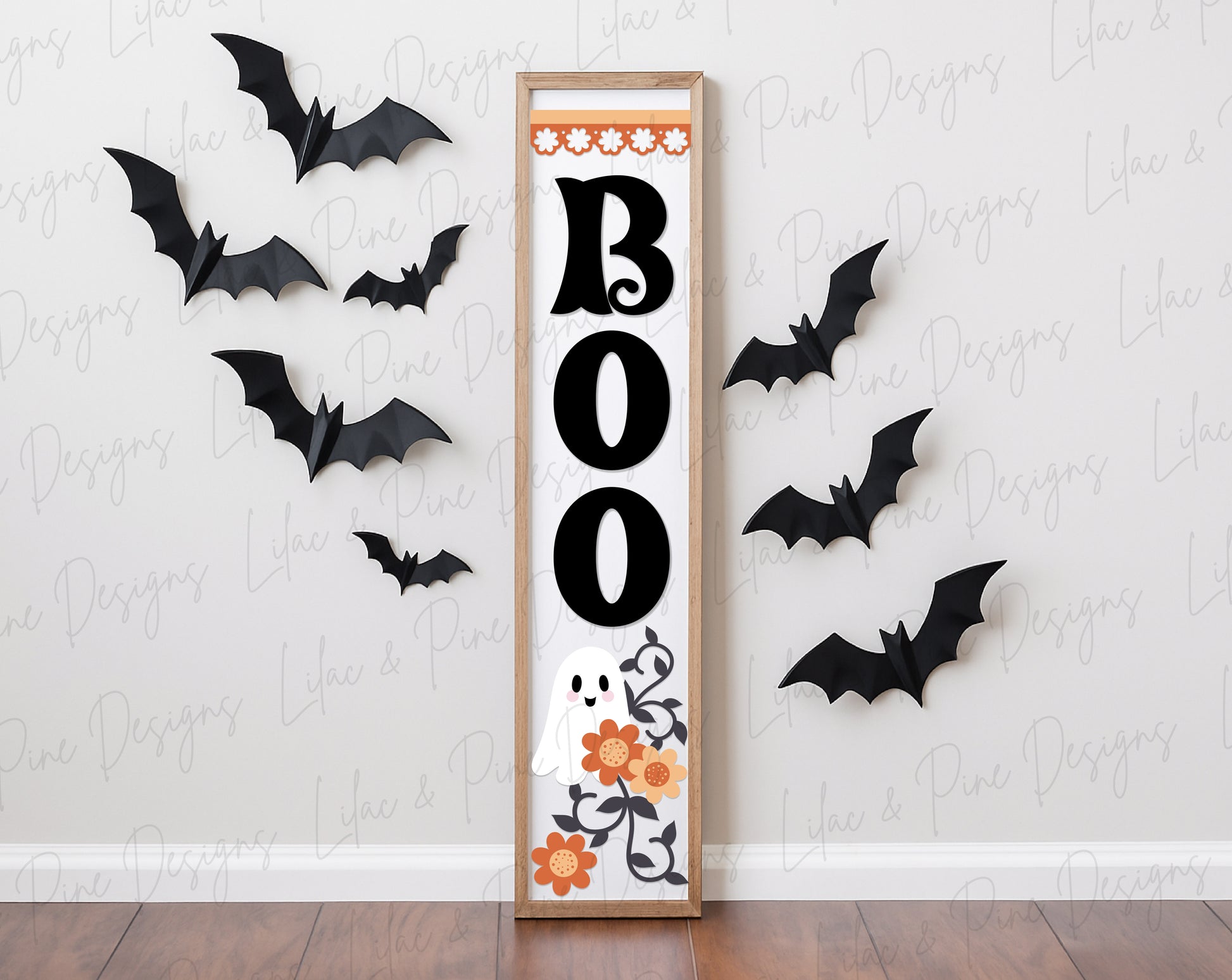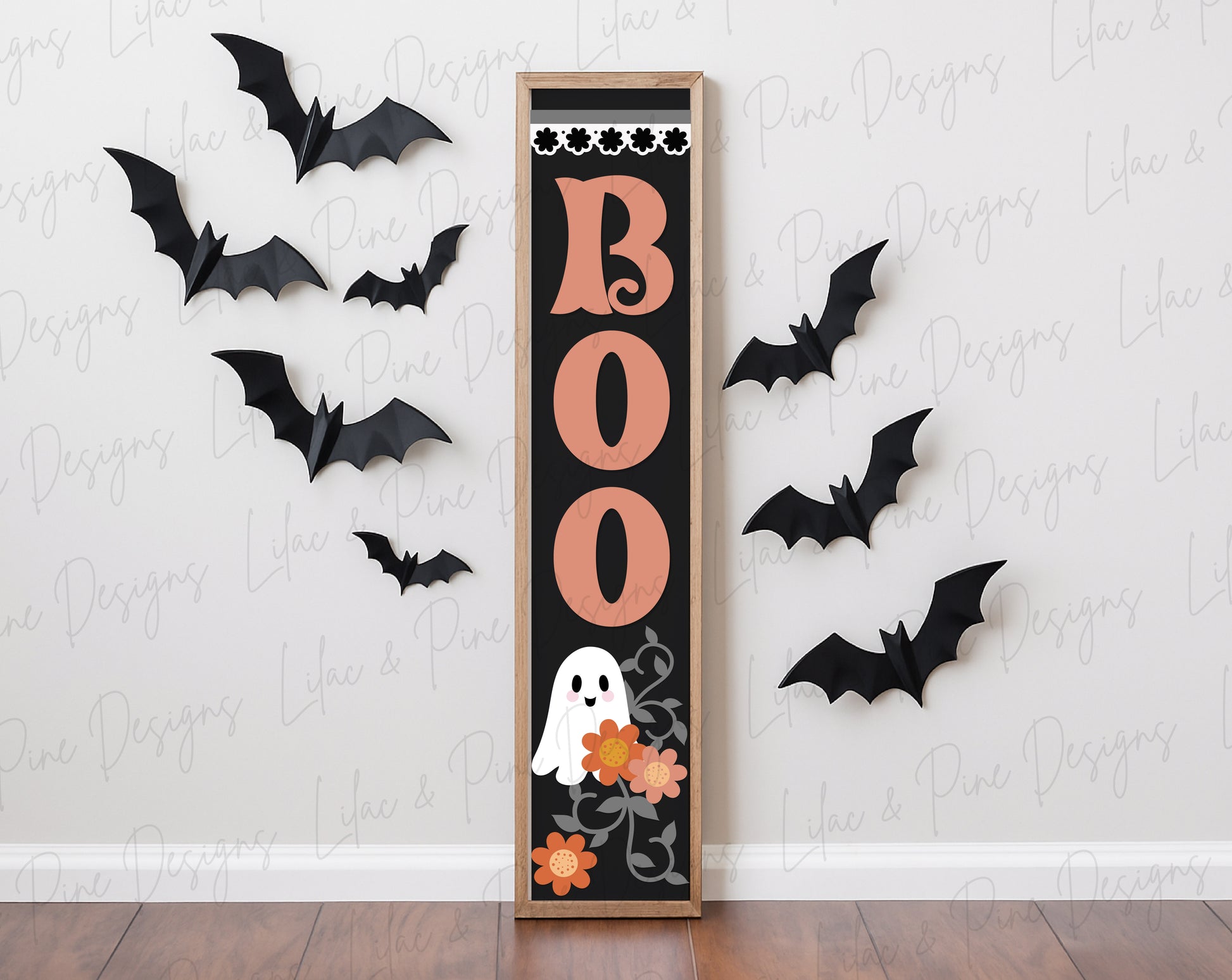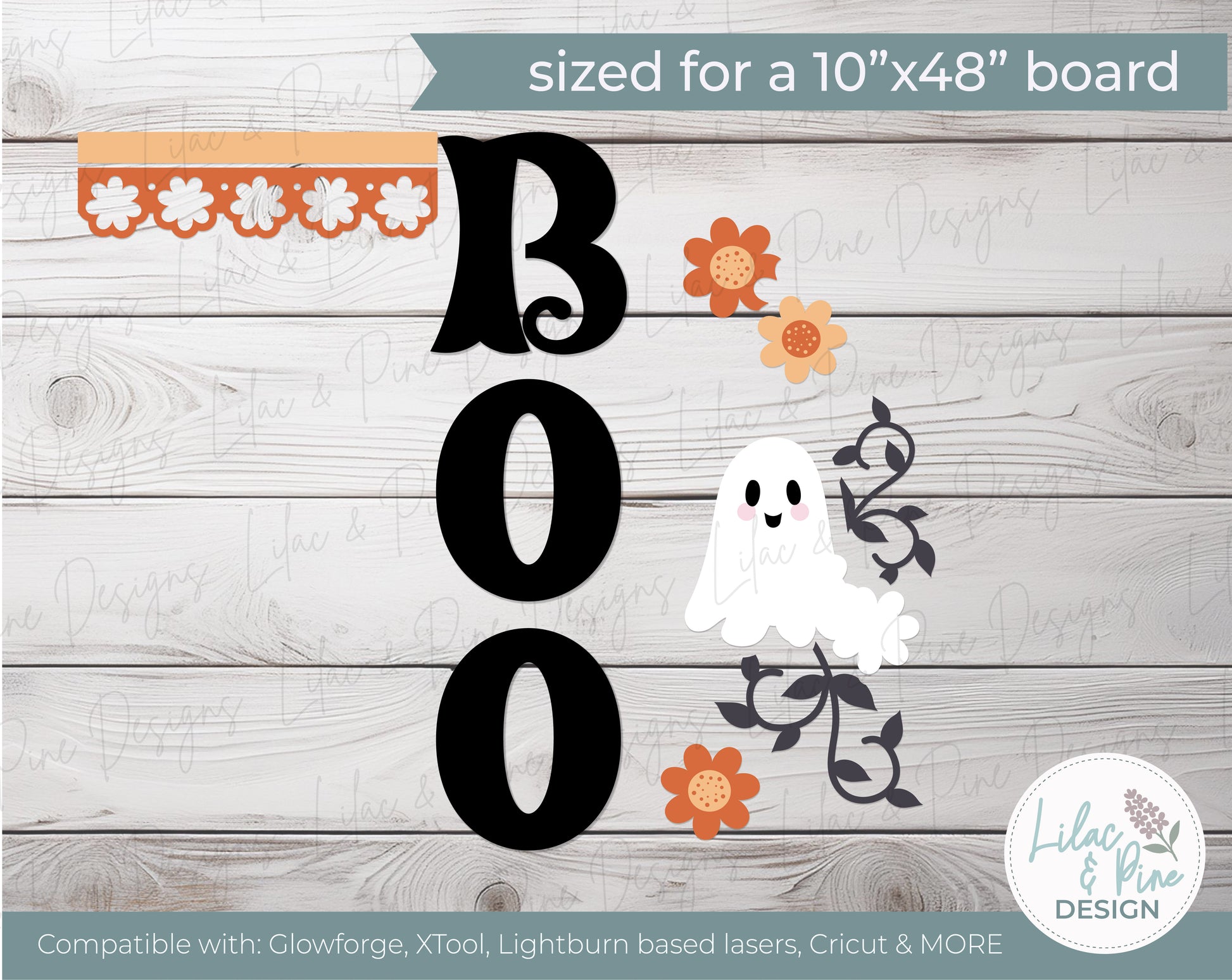 Boo Halloween Porch Leaner SVG - Cute Floral Ghost vertical sign - Cricut SVG - laser cut file: Glowforge, xTool, Lightburn