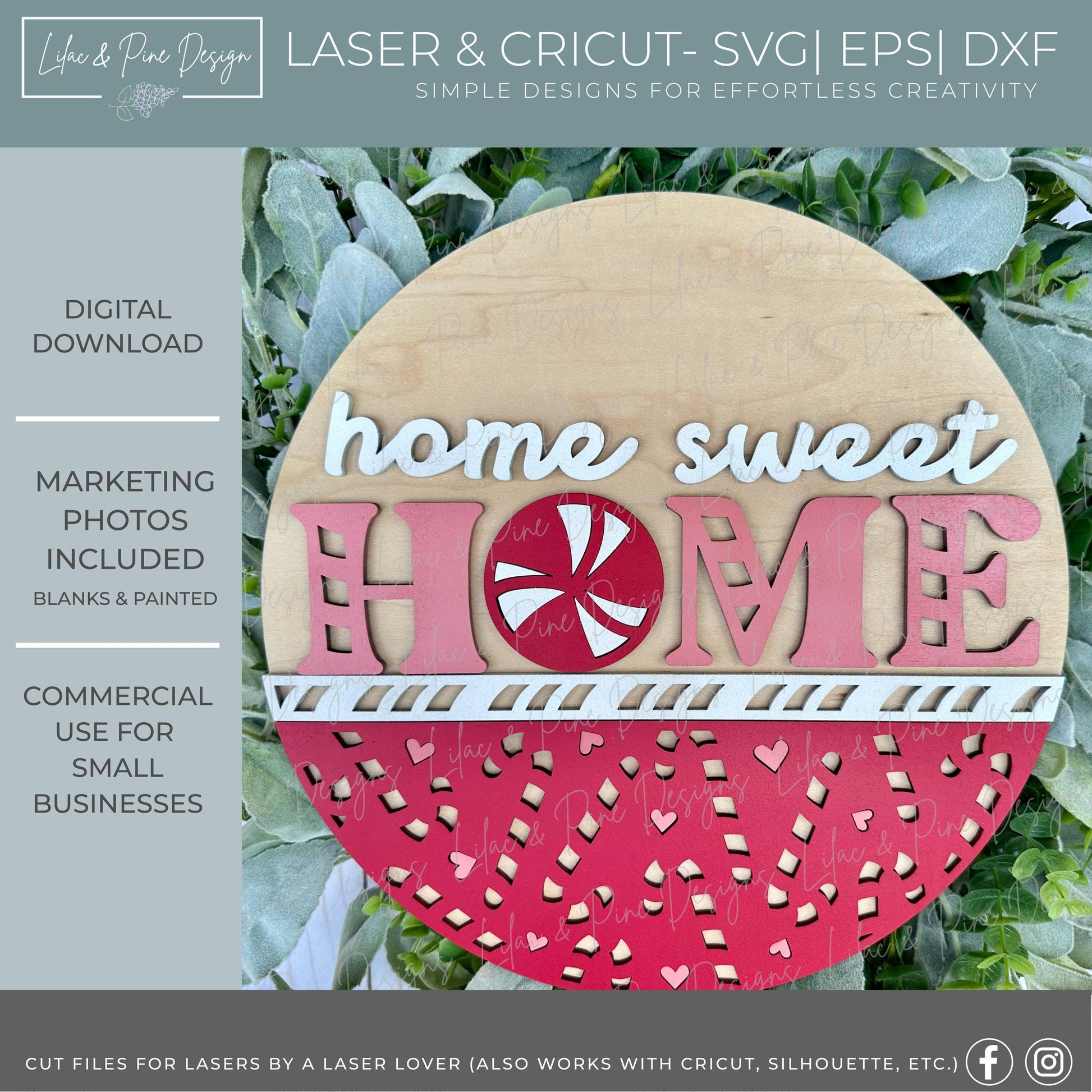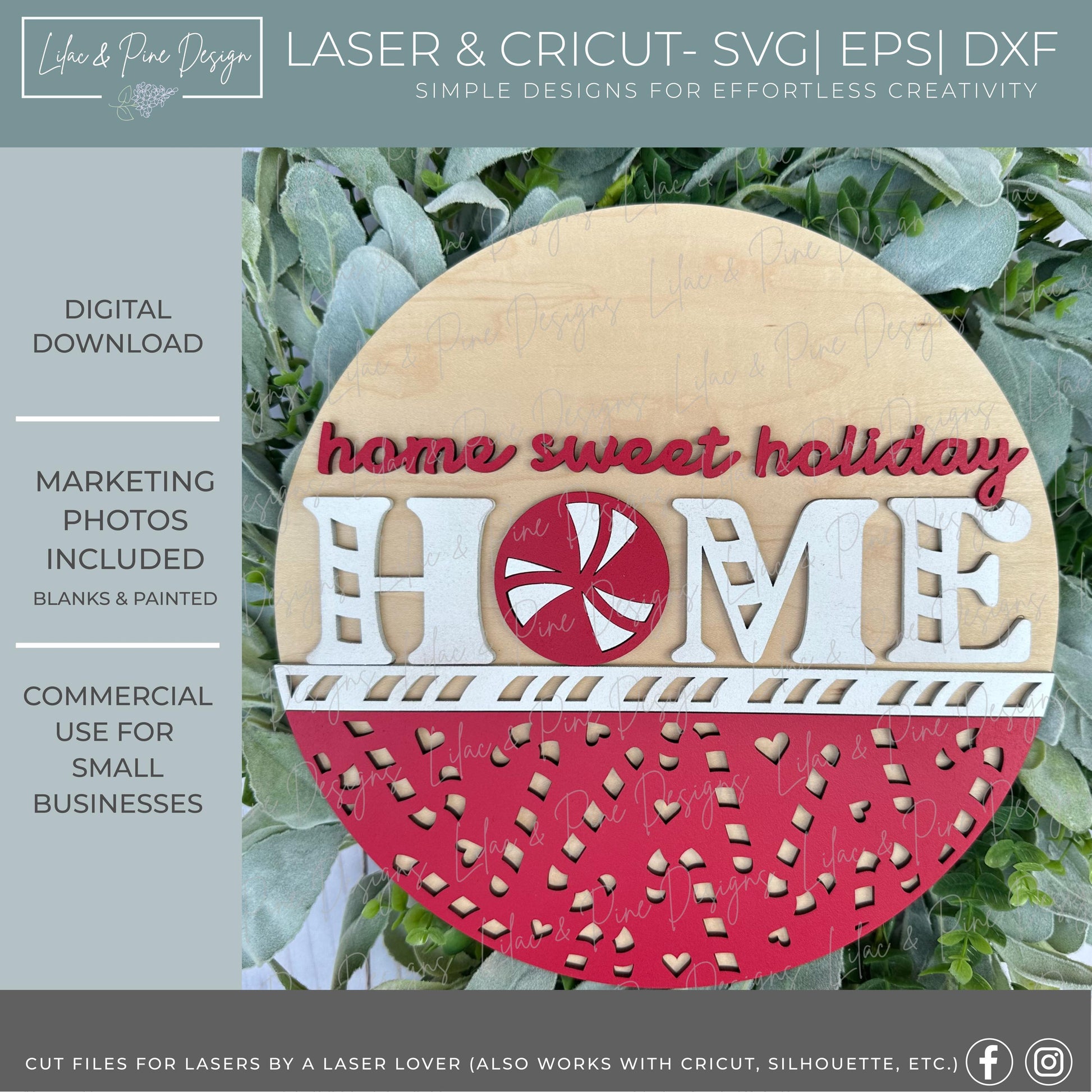 Add sweet charm to your holiday porch decor with this cheerful peppermint sign! Featuring the choice of 2 messages - Home sweet home or Home sweet holiday home, this laser-ready digital file is perfect for door hangers, wall decor, paint parties, or market-ready holiday products. This Laser Ready Christmas SVG for Glowforge, xTool, Mira, Thunder and other Lightburn lasers cuts clean and paints and assembles easily.
