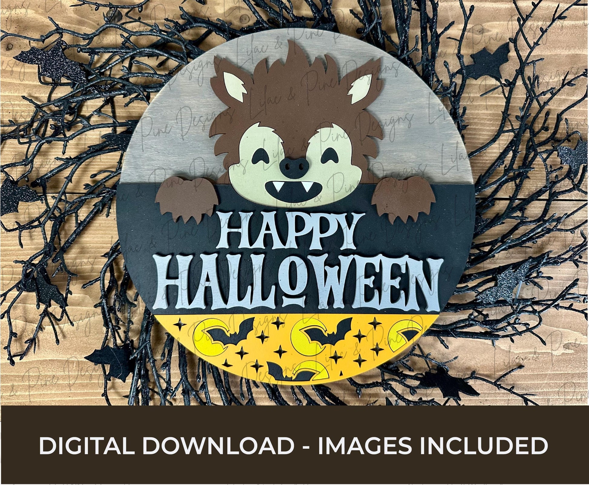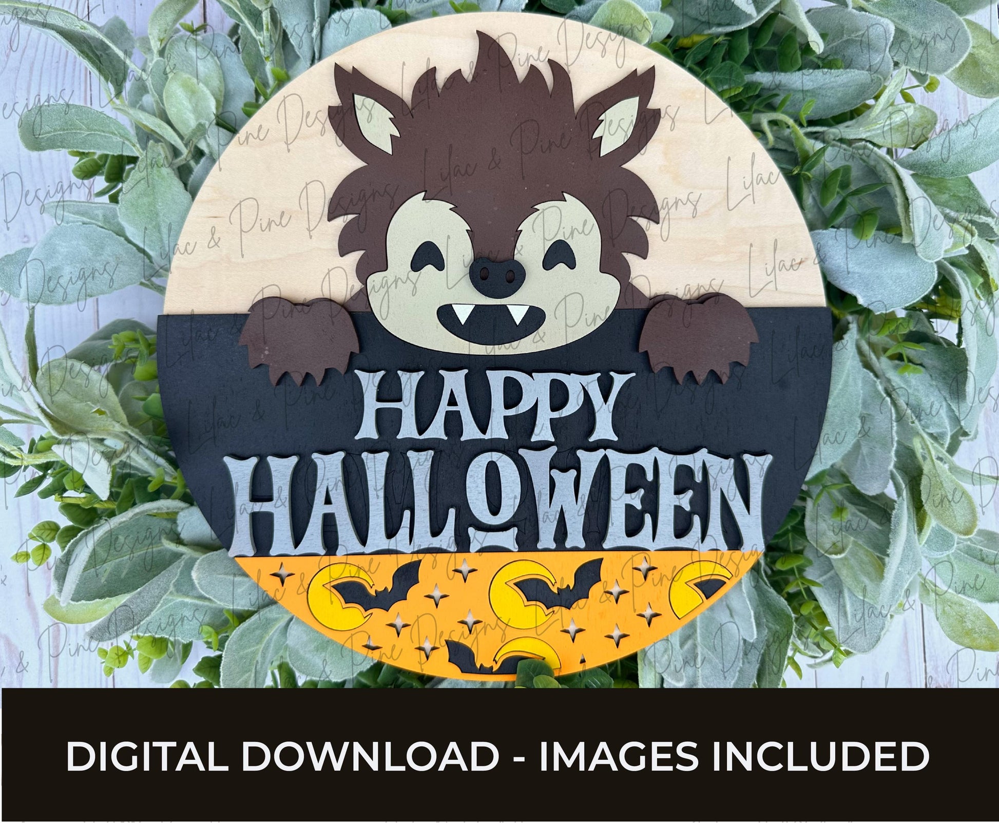 This layered round werewolf sign is the perfect mix of spooky and cute! Featuring a grinning werewolf popping over bold text and a moon-and-bats patterned bottom, this design includes two versions: