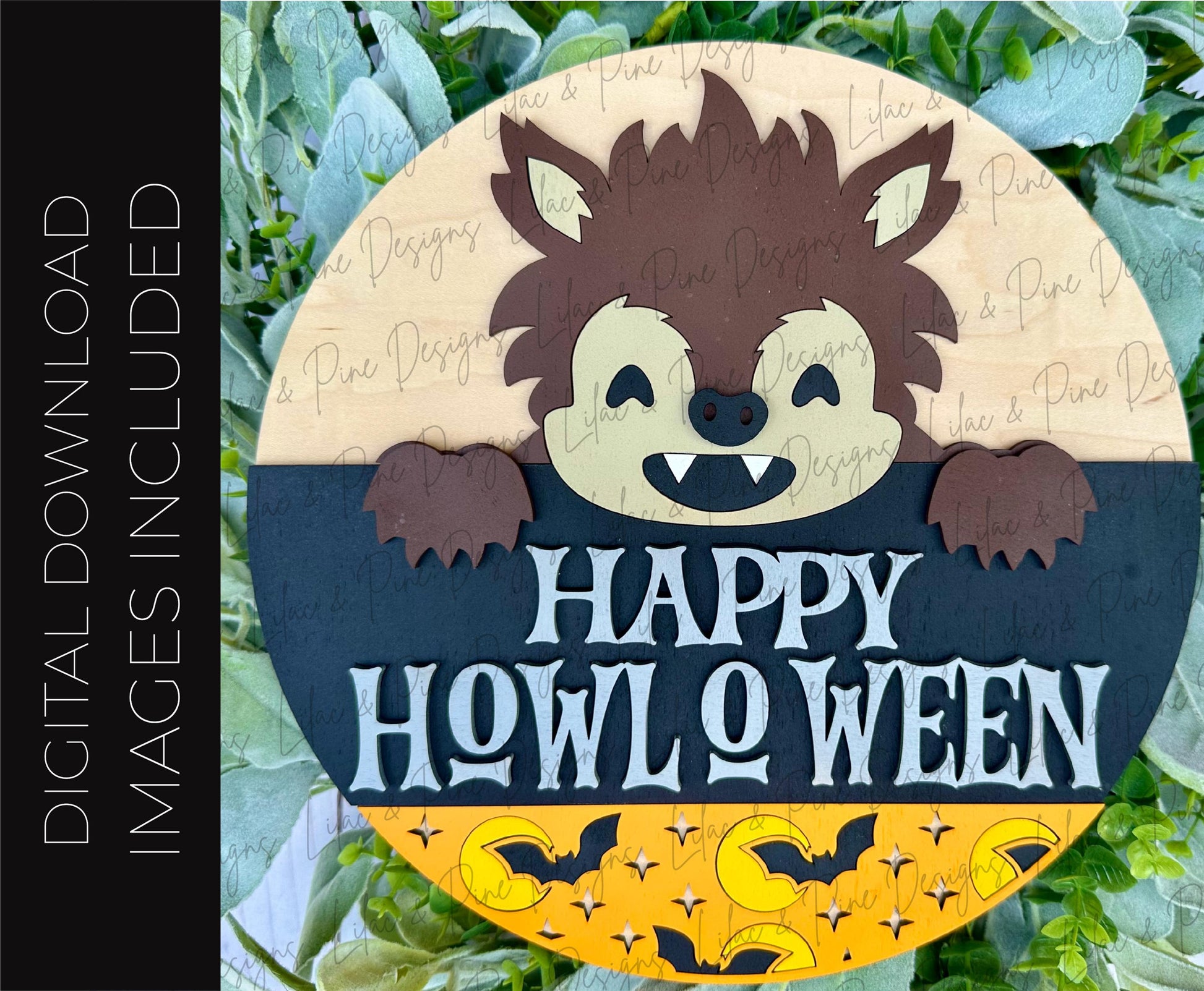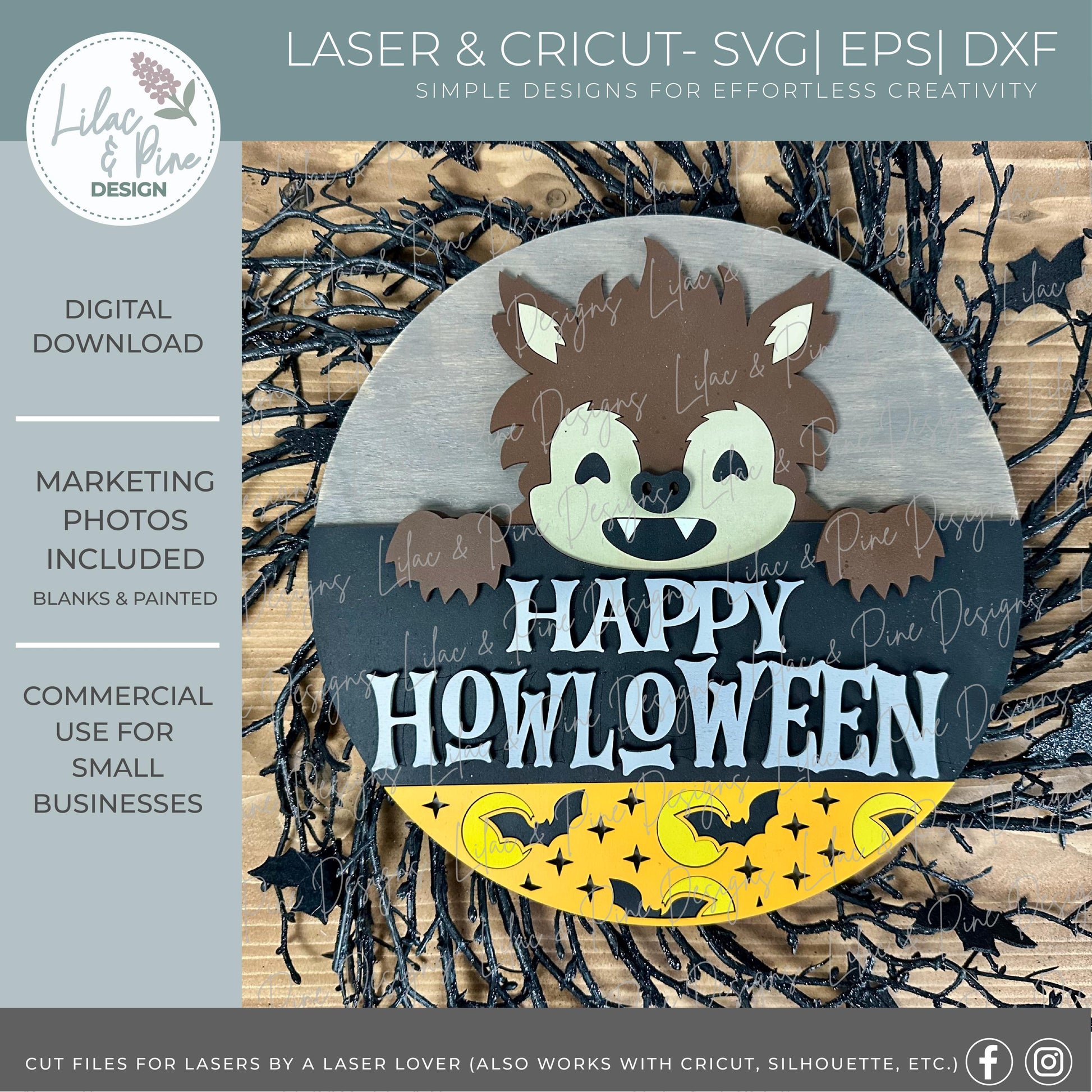 Cute Werewolf door hanger SVG - Happy Halloween door hanger - Happy Howl o ween SVG - bat patterned welcome sign - laser cut files - Cricut