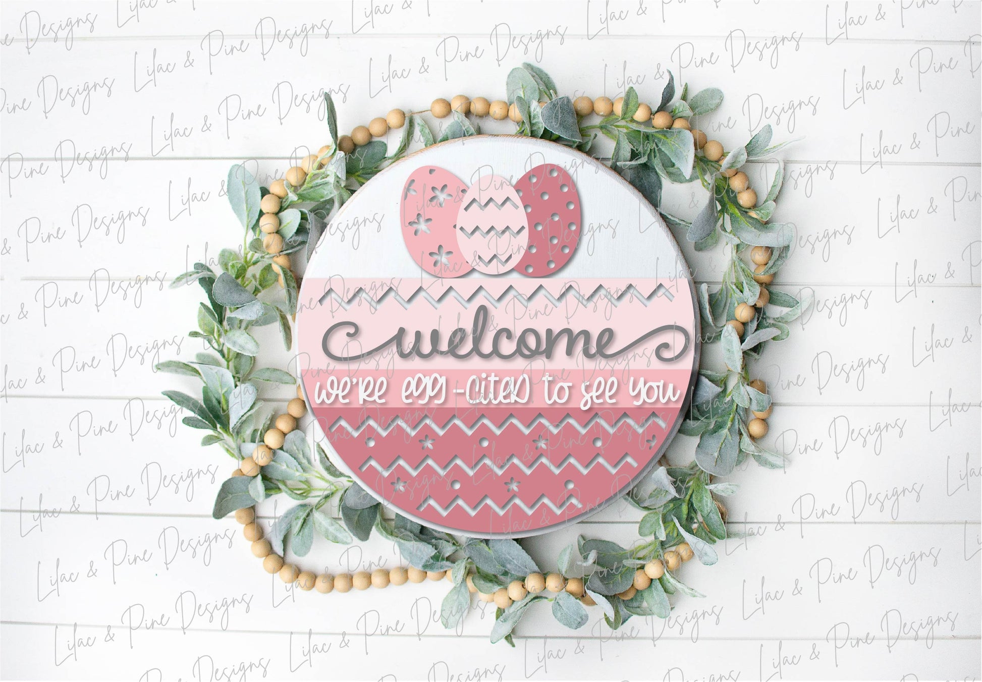 Welcome your guest with this fun Easter Welcome door hanger - Welcome we're Eggcited to See You. This SVG design features a whimsical zig zag, floral and polka dot bottom with a trio of patterned Easter eggs at the top. This decorative spring sign will fit many decor styles including the popular modern farmhouse style. The design can be cut with or without the middle to save material. The easy paint design makes it perfect for sign parties, DIY kits, and craft fairs.
