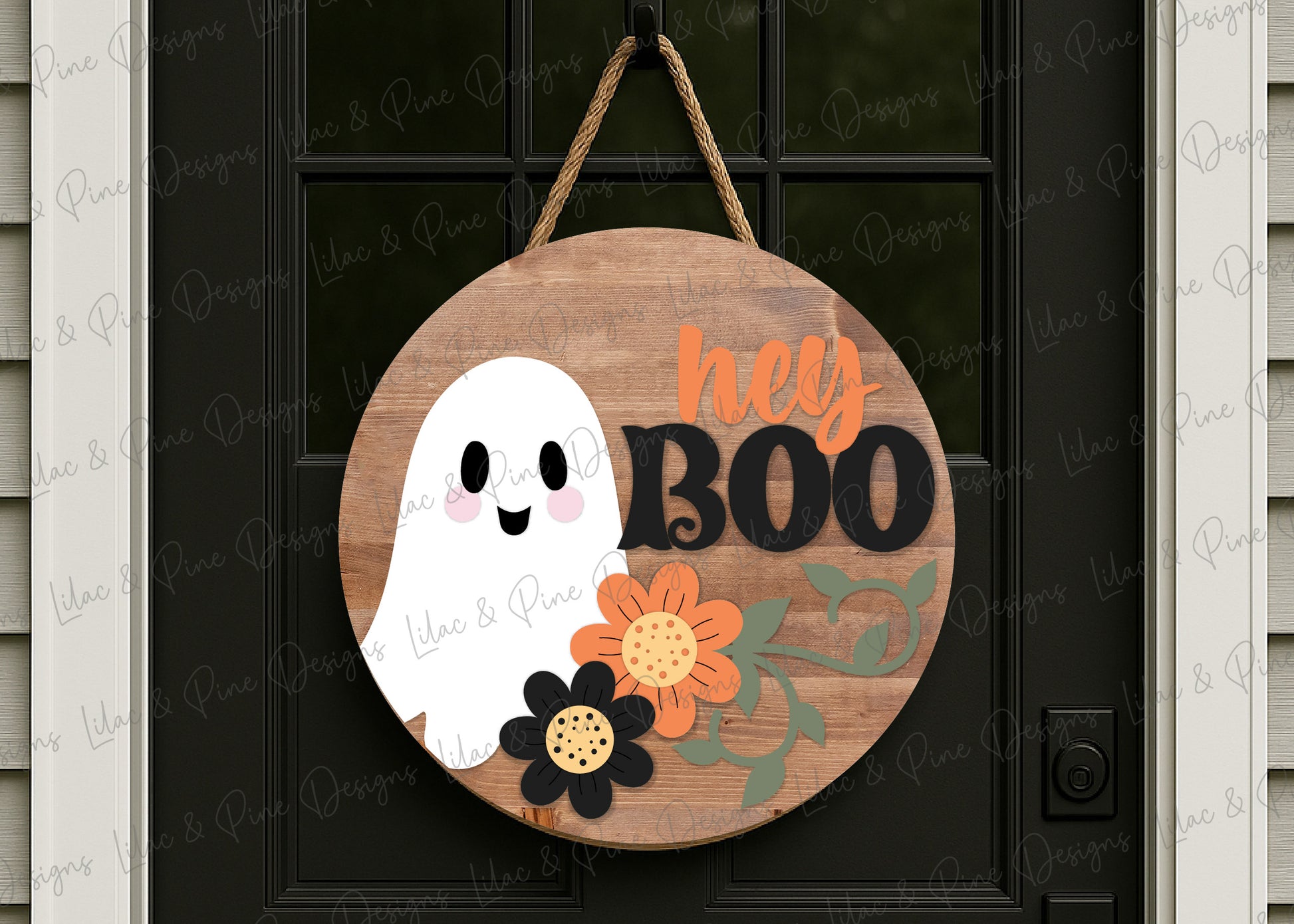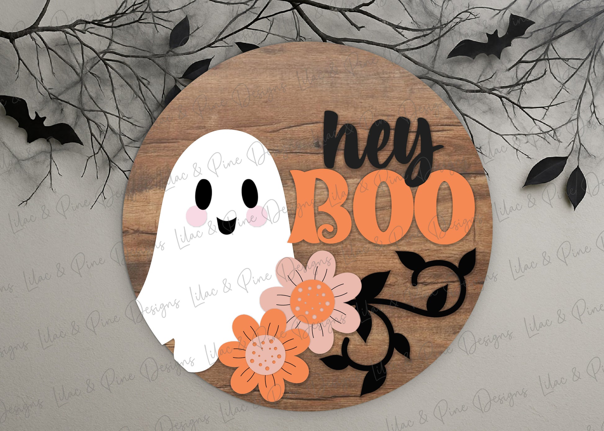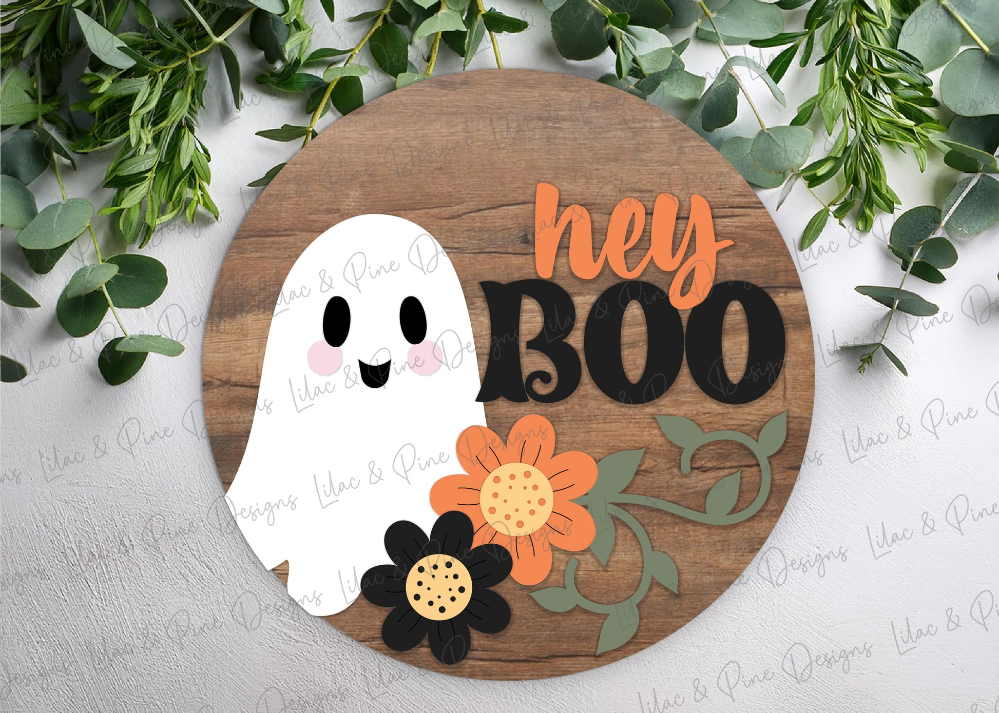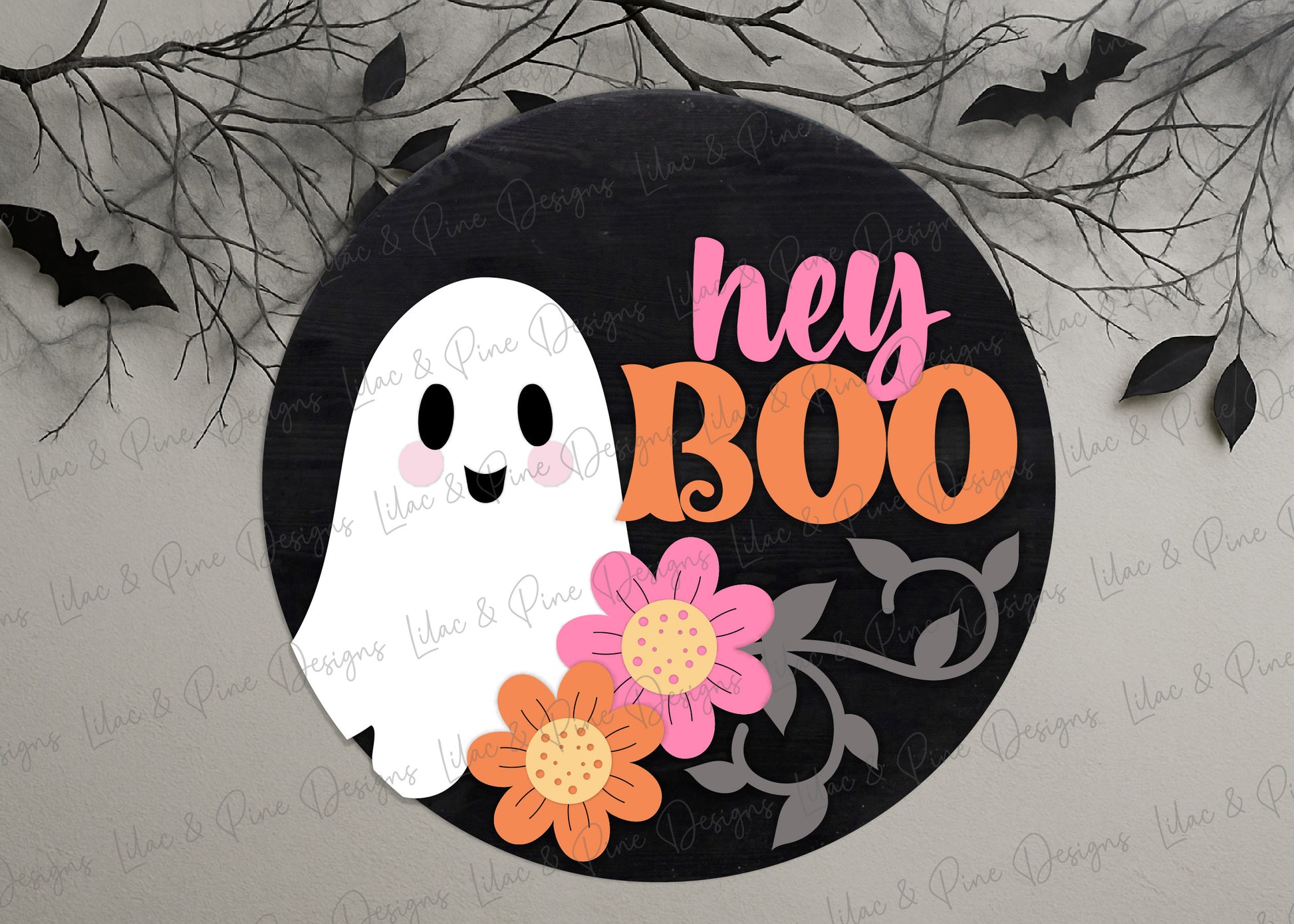 Hey Boo Ghost Round SVG | Halloween Floral Door Hanger Laser Cut File | Cute Halloween Sign SVG
