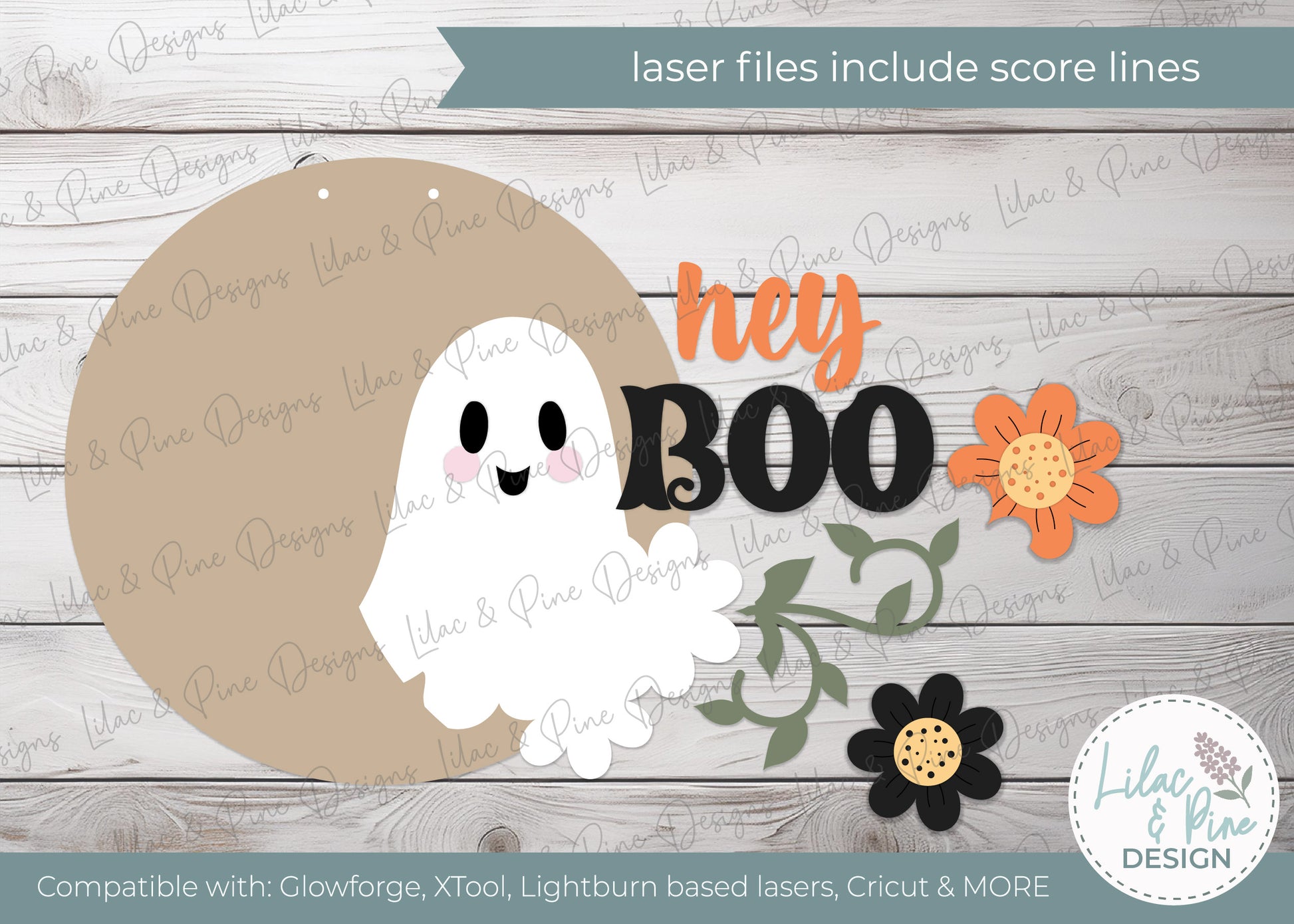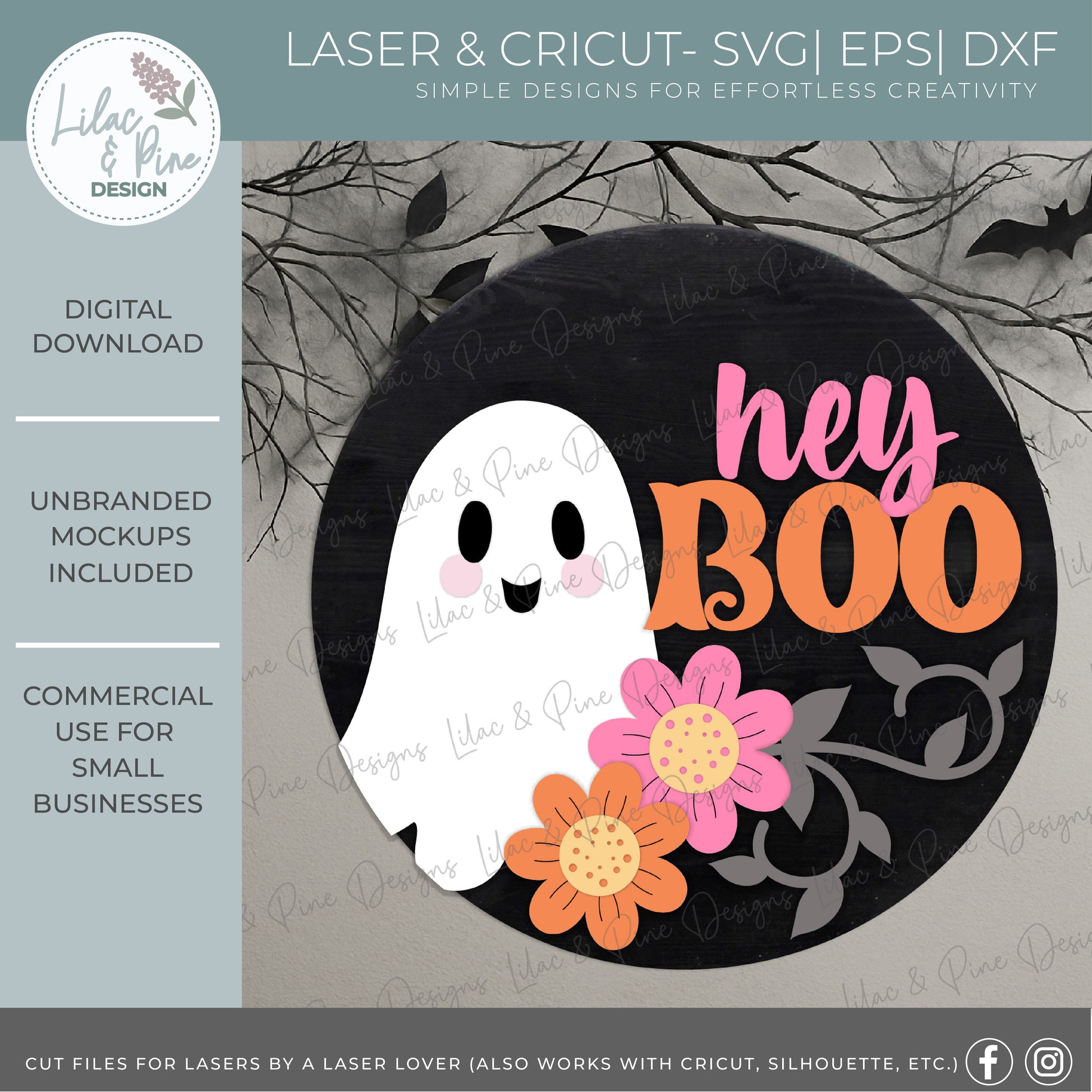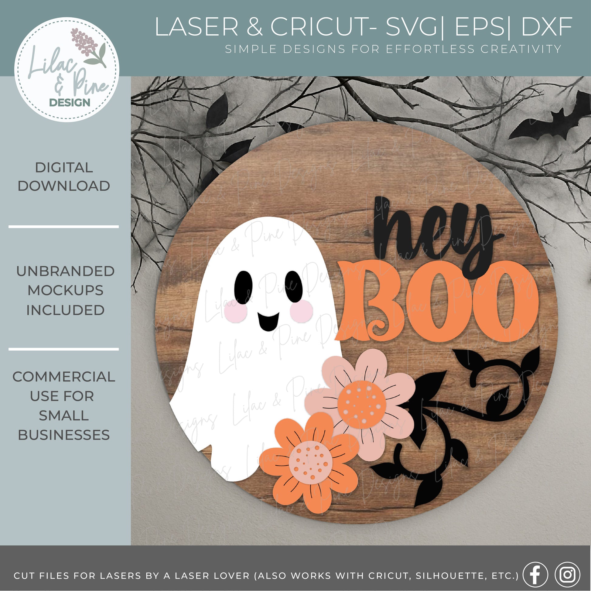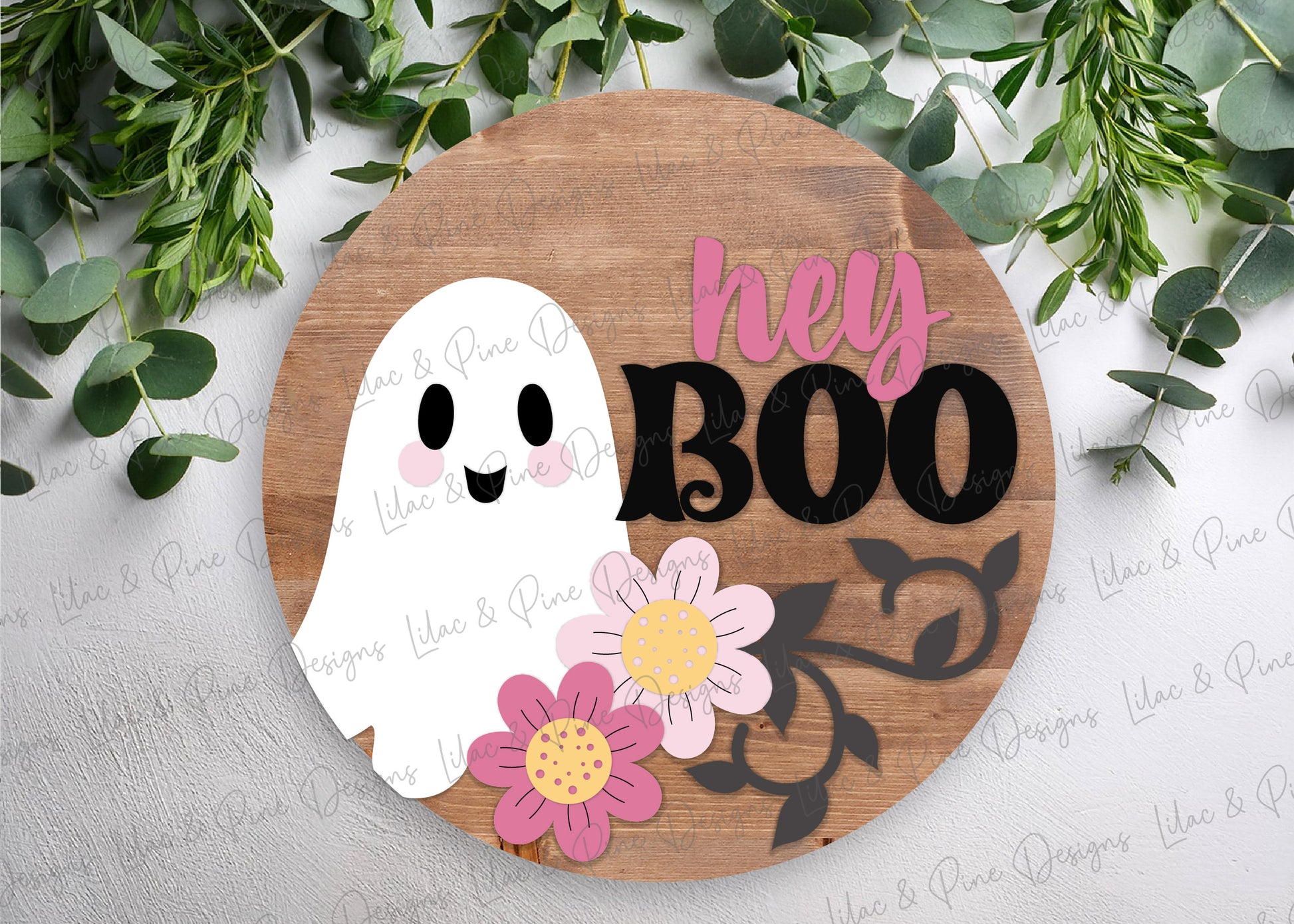 Hey Boo Ghost Round SVG | Halloween Floral Door Hanger Laser Cut File | Cute Halloween Sign SVG