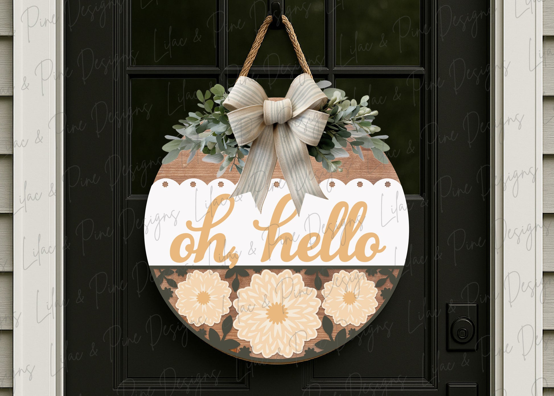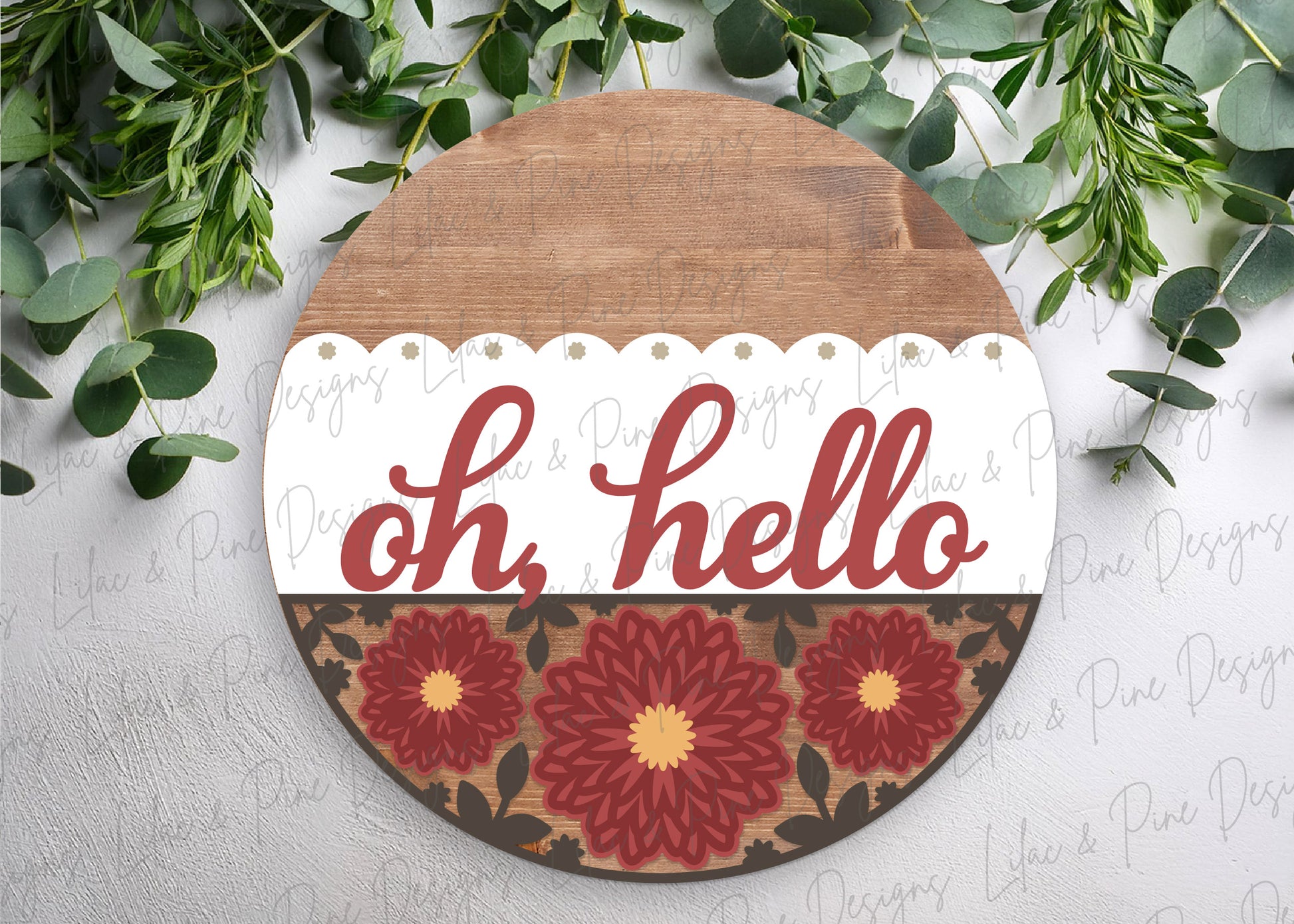 This sweet and simple 'Oh Hello' round sign features bold mums and a delicate scalloped border. It’s a simple, feminine choice for your fall door décor. Paint in pastel creams and yellows for a soft choice or bold oranges or maroons for a traditional fall version.