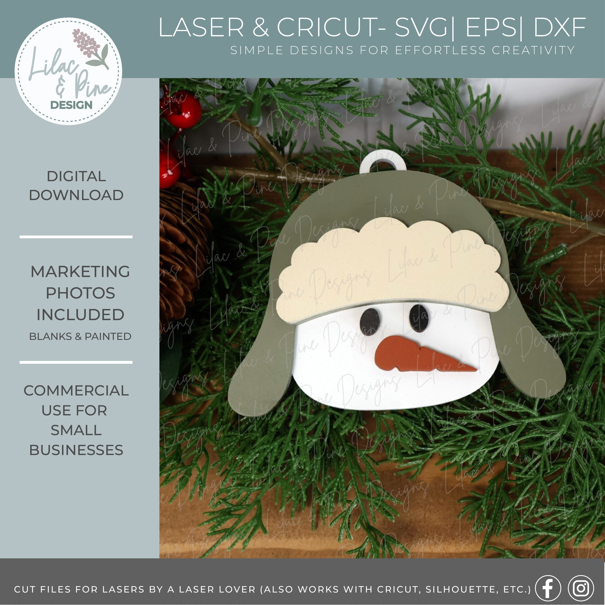 Bring on the cozy charm with this trapper hat snowman ornament SVG, featuring optional phrases and personalization plates for that extra heartfelt touch. With its layered trapper hat, classic carrot nose, and clean lines, this design is ideal for quick assembly.