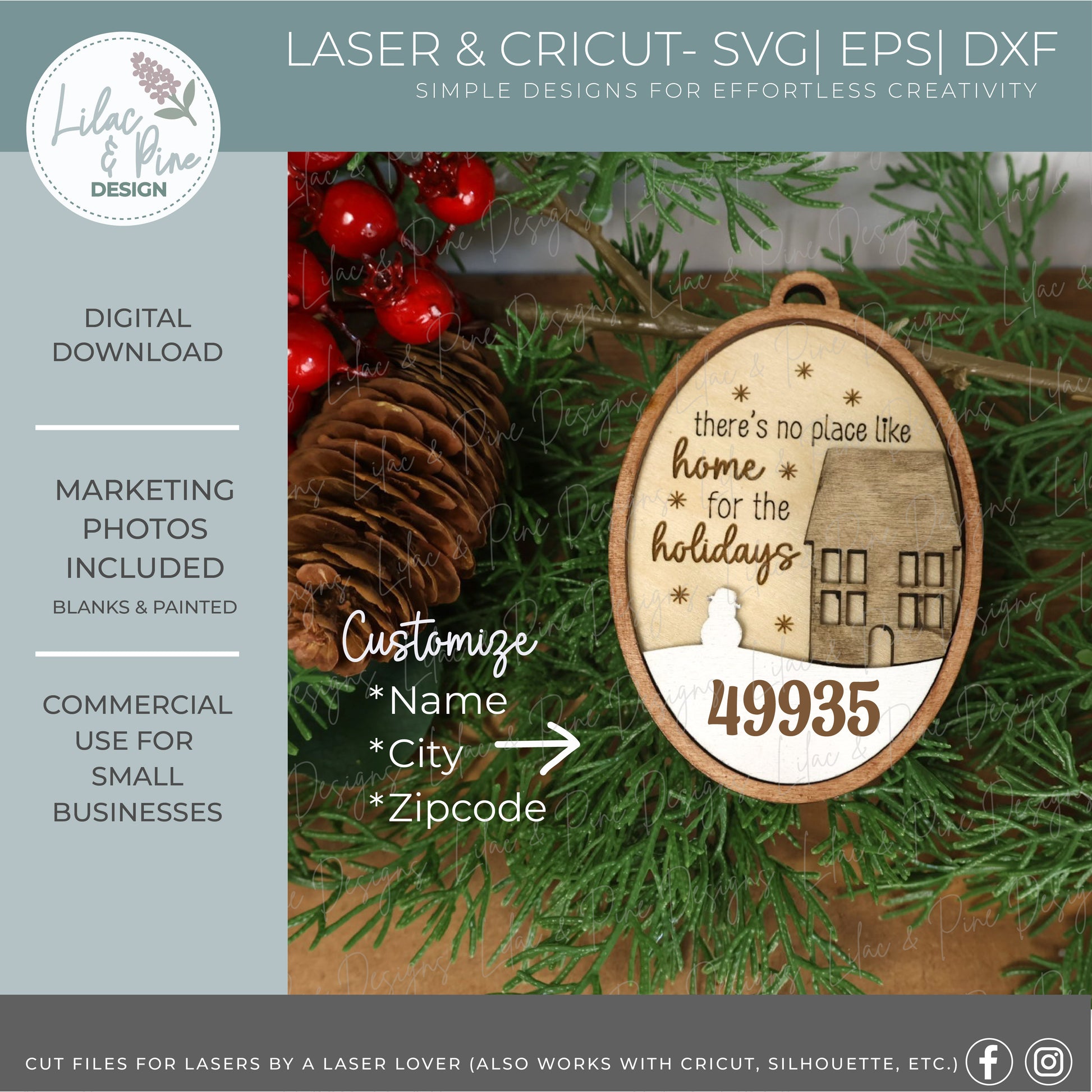 Celebrate where the heart is with this layered snowy village ornament SVG, complete with a charming winter house, falling snow, and the beloved phrase “There’s no place like home for the holidays.” The customizable lower panel lets you add a name, city, or zip code, making it the perfect gift for family, clients, gift shops, or holiday markets.