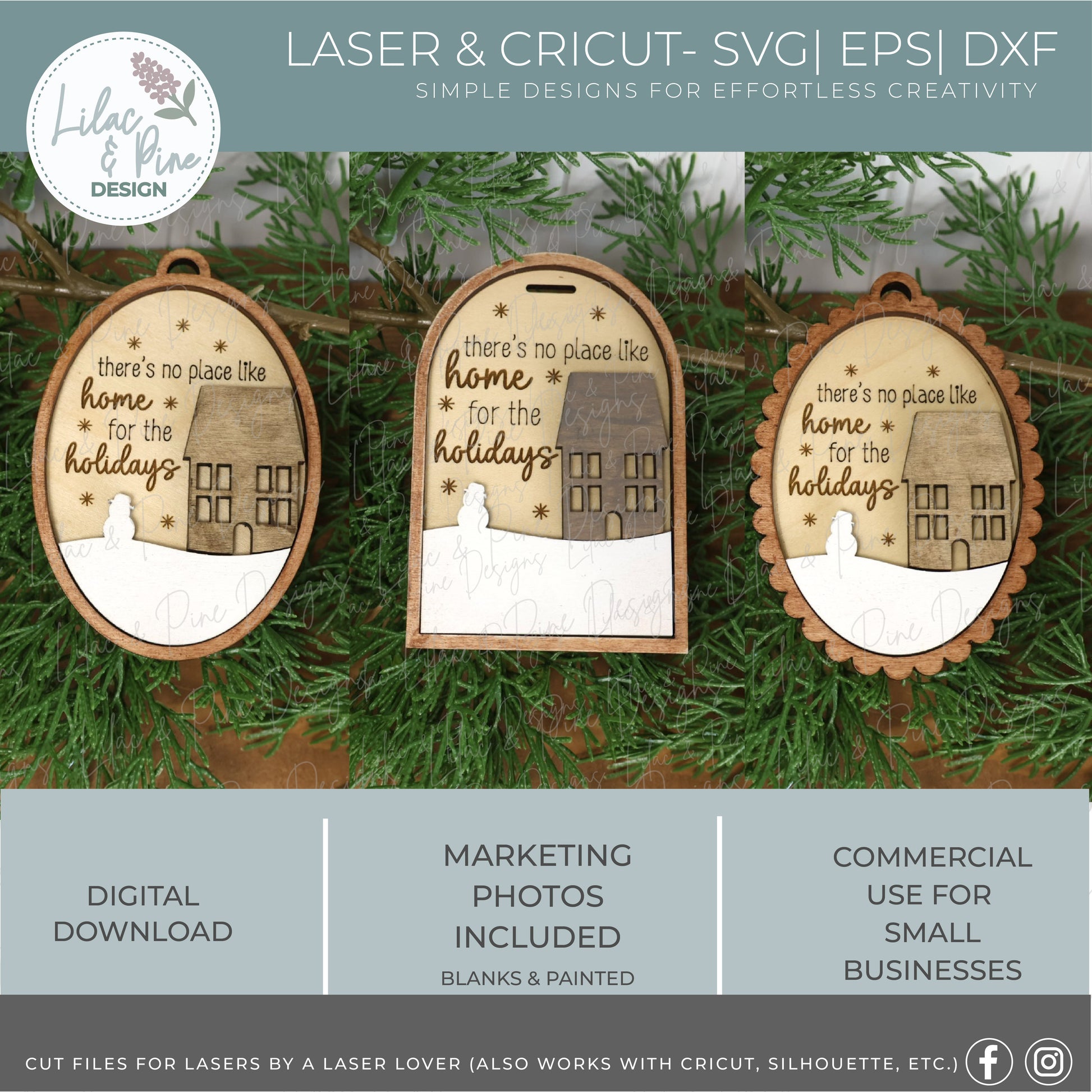 Snowy House Ornament bundle SVG – Home for the Holidays Christmas design - oval, scalloped oval and arch customizable ornaments - laser cut file for personalization
