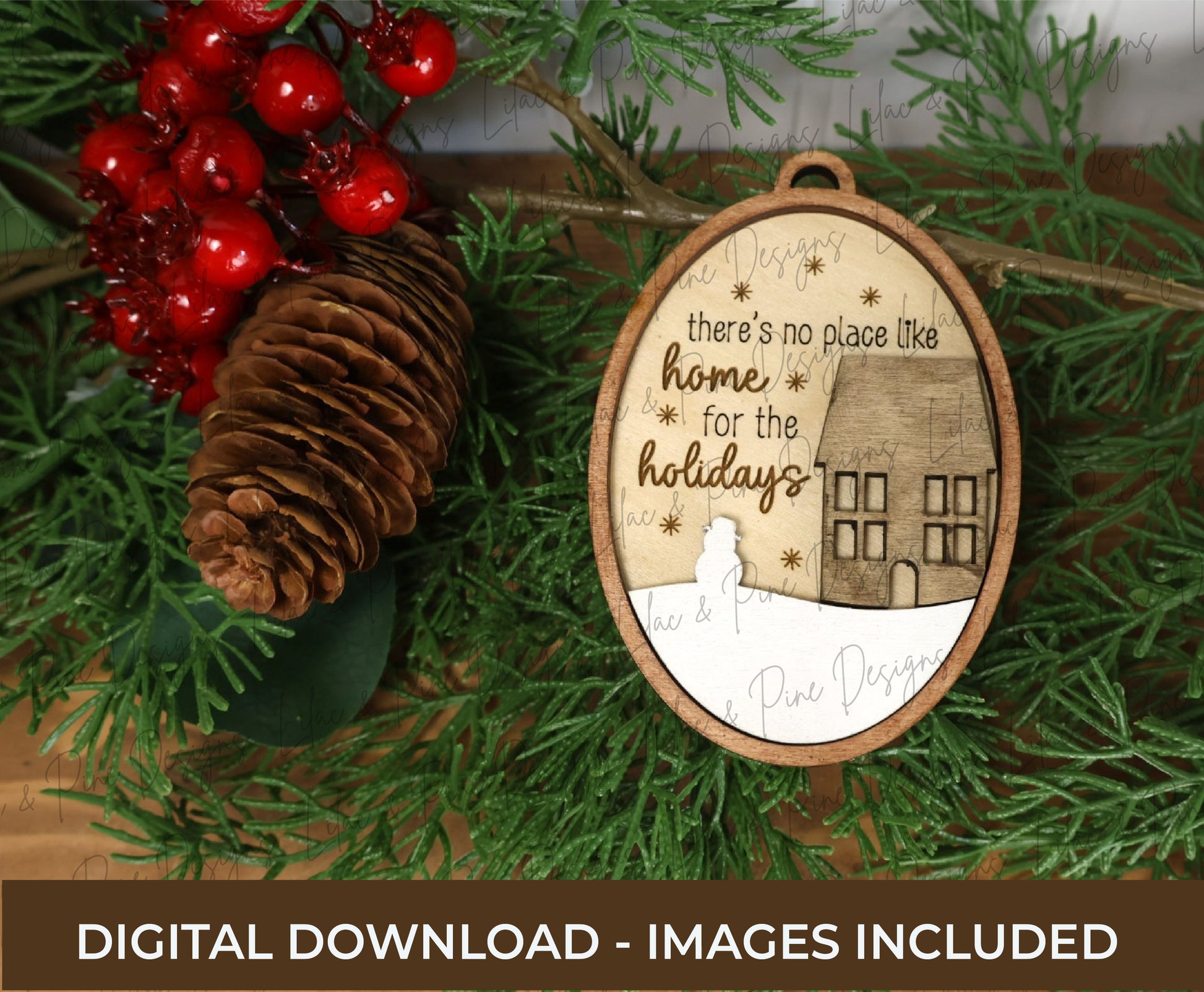 Snowy House Ornament SVG – Home for the Holidays oval design - customizable ornament - laser cut file for personalization