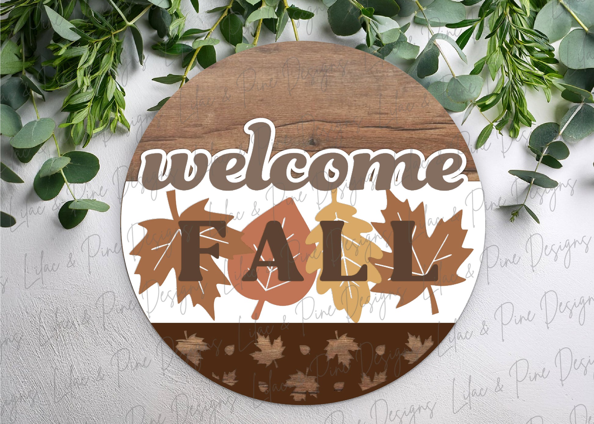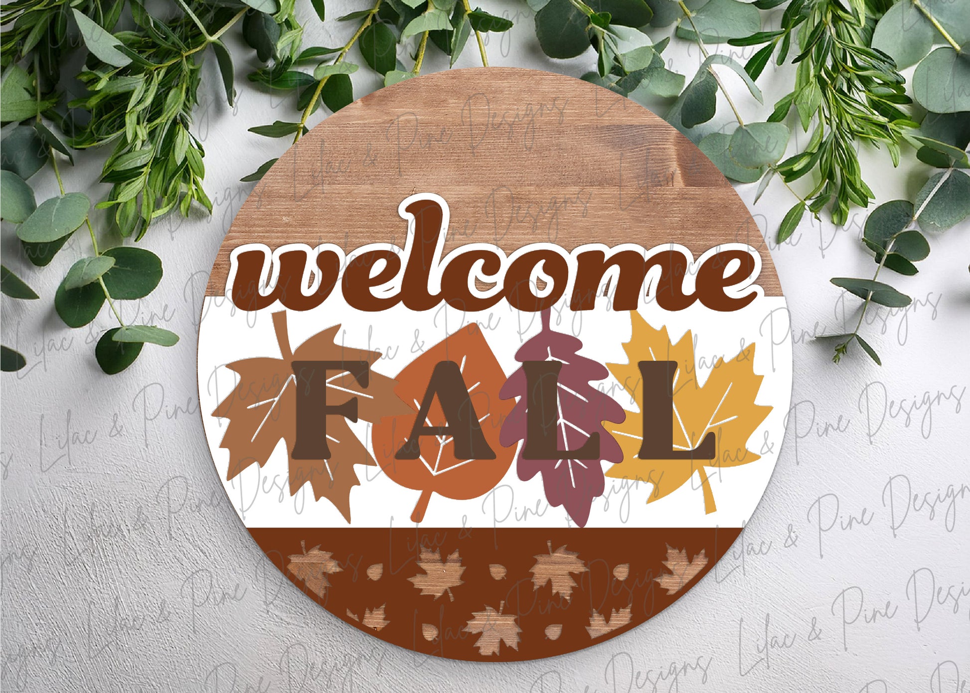 Say hello to autumn with this playful 'Welcome Fall' round featuring simple, layered leaves and a leaf-patterned base. This is a cheerful and clean-cut design to bring warmth to your shop or front door.
